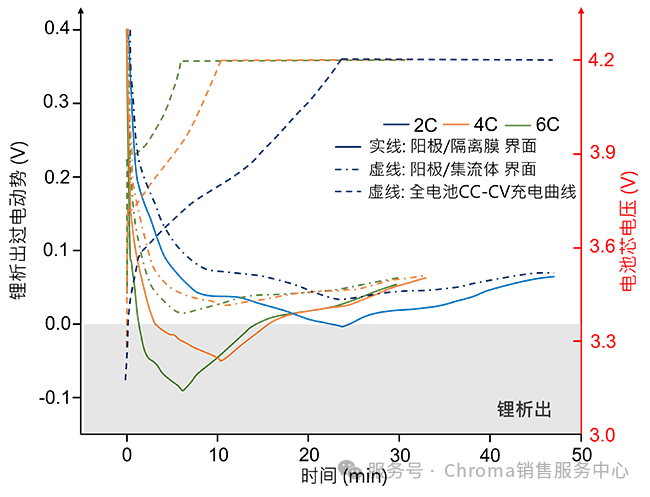 車廠與電芯廠的研究單位在進行三電極鋰析出(Lithium Plating)實驗時,主要目的是厘清鍍鋰的臨界條件與發生邊界。實驗常透過調變充電倍率、電壓截止點、操作溫度,或仿真實際工況下的充放電循環,誘發電池內部老化,并觀察負極相對于參考電極的電位變化。美國電化學會(The Electrochemical Society, ECS)期刊中,Wenlong Xie, Shichun Yang等人透過將鋰電池解耦成三電極電池進行不同C-rate下的快速充電[1],觀察陽極電位在鋰析出程度上的差異(下圖二)。