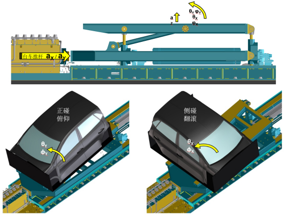 另一項革命性的尖端測試設備是主動俯仰或滾轉運動模擬 (APRS) 系統。該系統可與反向加速度碰撞模擬彈射裝置協同工作,模擬車輛在碰撞事故中的多自由度 (DOF) 運動。
