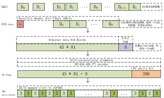 RS-FEC編碼:進行加擾,RS-FEC編碼和添加396bit的RS-FEC奇偶校驗位進行糾錯;
