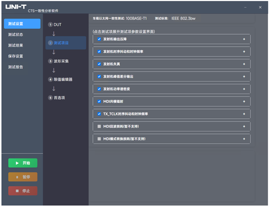優利德推出的100/1000BASE-T1一致性分析方案具備高度自動化的測試控制流程,以直觀的UI界面引導用戶完成各項設置和操作,生成測試報告。您可以根據自己所需的測試場景配置您的測試方案。
