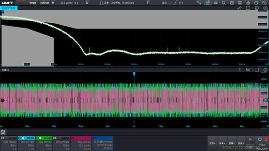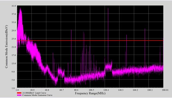 使用示波器的高級數學算法,對被測設備DUT的MDI端口出的射頻共模發射量進行測量,規范要求:MDI的共模發射量在1MHz~200MHz內不能超過24dBμV。