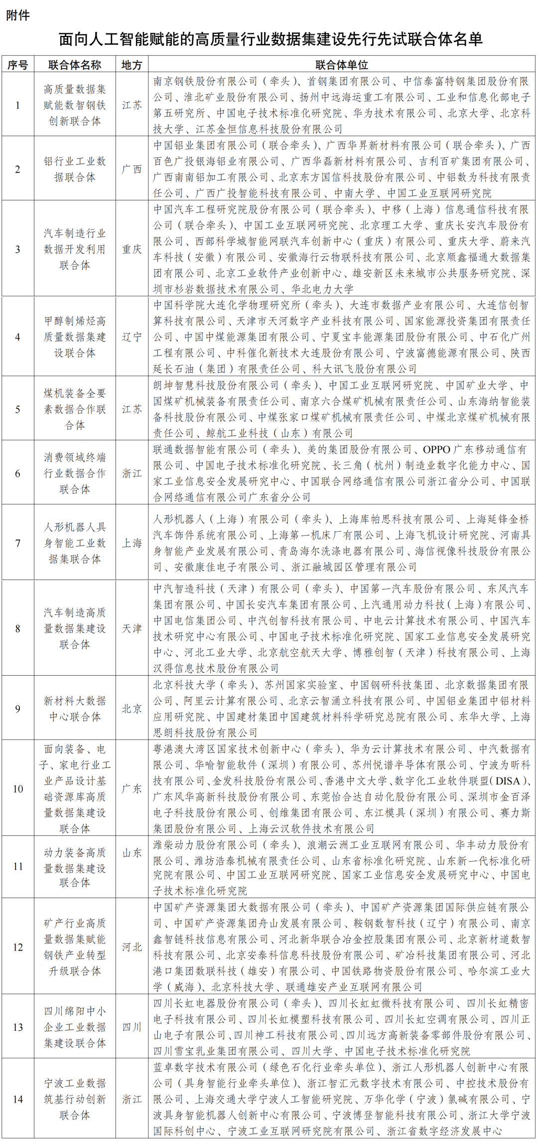 工業和信息化部于2026年4月公布的“面向人工智能賦能的高質量行業數據集建設先行先試聯合體名單”共包含14個聯合體,覆蓋鋼鐵、汽車、裝備制造、礦產等多個重點行業。
