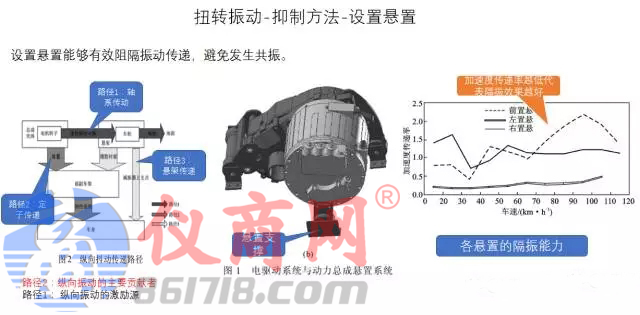 車輛振動的一次振源一般是電機或減速器,從振源到振體的力波傳遞有兩個途徑,途徑一是通過軸系傳遞,途徑二是通過定子組件到車架。有人做過分析研究發現途徑二是車輛振動的主要傳遞路徑。因此在途徑二上設置柔性或者半剛性懸置能夠大大降低共振風險,即便共振幅值也會大幅度降低。如下圖所示有人通過優化電機三個懸置的位置、剛度,達到了很好的隔振效果,加速度傳遞率不到2.5%。