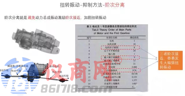 還有一種系統級的優化方法,就是階次分離法。階次分離就是避免動力總成振動激勵階次接近,加劇扭轉振動。如下圖所示,電機轉子激勵的階次是8次、而軸承的激勵階次是9次和9.76次,三者的階次非常接近,很容易發生能量疊加,產生大幅度的振動。因此系統級的優化,就是要對動力總成各零件的激勵階次進行管理,避免出現階次重疊。以此類推也要對各零件的固有頻率進行管理,避免出現頻率重疊。