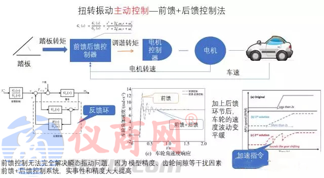 國外傾向于通過控制來解決扭轉振動問題,其優點在上一篇文章中已經有過論述。其中一種簡單的方法就是前饋控制法。其作用原理很簡單,如果已經發現車速在30km/h時會發生抖動。那么在這個速度段有針對性的控制轉矩輸出,讓轉矩輸出主動發生波動,這種波動產生的振動響應剛好和原來的抖動是相互抵消的,如此疊加之后的振動響應反而更平穩了。