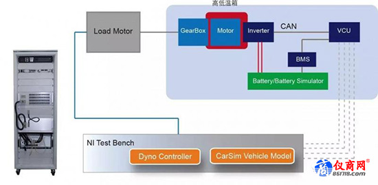 該系統(tǒng)主要包含被測電機及控制器、負載電機及控制器、冷卻系統(tǒng)、高低溫實驗箱、操作控制臺、功率分析儀、機械固定臺架等。