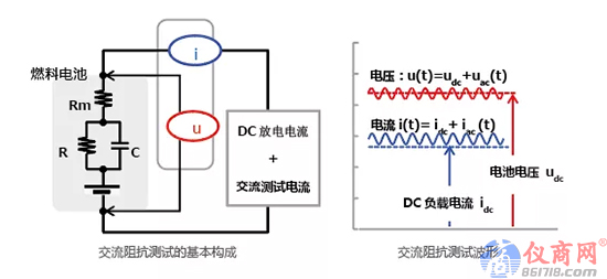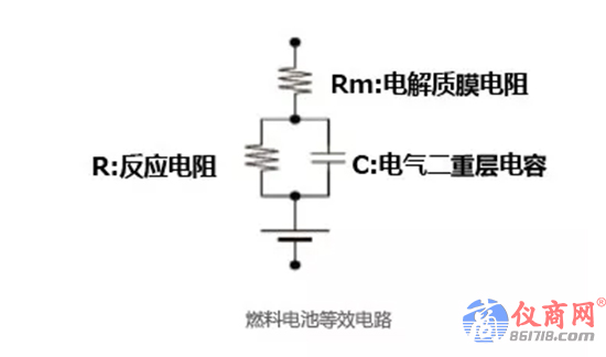 燃料電池等效電路主要由電解質(zhì)膜電阻(Rm)和二重層電容(C)與反應(yīng)電阻(R)的并聯(lián)所構(gòu)成。這些電阻、電容值會隨電池的性能和發(fā)電狀態(tài)發(fā)生很大變化。通過交流阻抗測量,可以間接測量到這些電阻和電容值,對燃料電池的評價起到非常重要的作用。