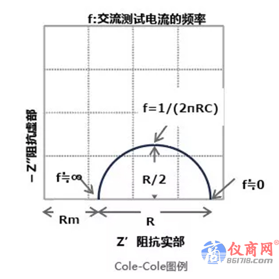 通過對疊加的交流信號頻率的調(diào)整,測量阻抗的實部和虛部,可以得到Cole-Cole模型圖,如下圖,可以分析得到電解質(zhì)膜電阻(Rm)和電氣二重層電容(C)以及反應(yīng)電阻(R)。