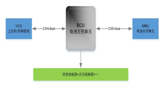 CAN-bus通訊在汽車電子中一直是霸主地位,所以,毫無例外地在動力電池組的測試中充當著重要的通訊角色,如圖所示,動力電池系統內部雖不復雜,但也是依靠CAN-bus總線來通信的。