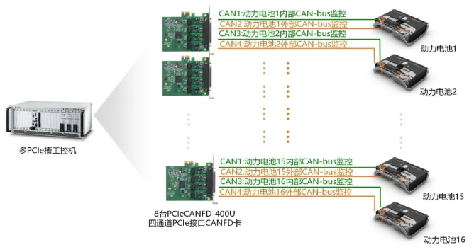 若電池測試項目現場使用多PCIe槽的工控機,ZLG致遠電子提供多通道PCIe接口的PCIeCANFD-400U卡搭載工控機來進行監控的方案,外擴4路相互獨立的CAN/CANFD通道,實時監控動力電池內外CAN/CANFD總線的情況。