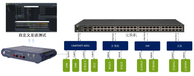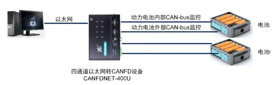 若測試現場采用以太網來實現整個測試情況的監控,ZLG致遠電子推出多通道CAN/CANFD轉以太網設備CANFDNET-400U通用方案,通過以太網實現“一拖四”CAN/CANFD相互獨立的通道,甚至ZLG還提供多大8通道的CANET-8E-U,實現8路CAN通道電池數據的監控。