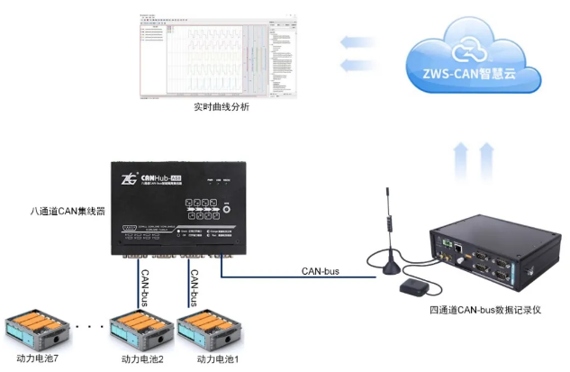 動力電池測試過程中,每個電池組的BMS都是相同配置(CAN協議報文完全相同),因此進行組合時需要進行區分管理。行業用戶可使用CANHub-AS8集線器進行組網區分。基于無人值守需求,ZLG致遠電子推出可遠程實時監控設備CANDTU-400EWGR,通過ZWS-CAN智慧云平臺對整個動力電池系統進行實時管理。
