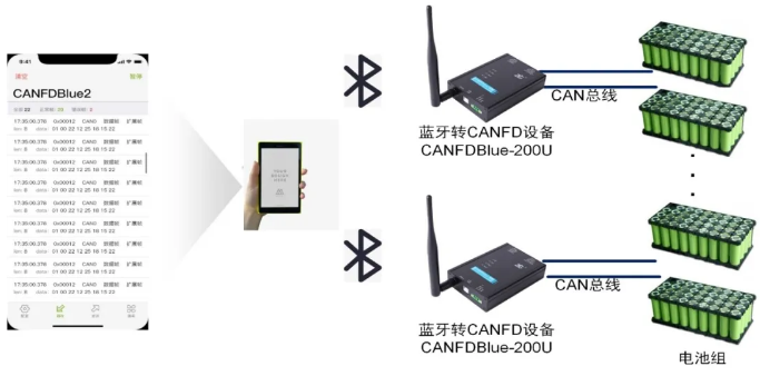 為方便動力電池行業用戶更好的進行移動端數據監控,ZLG致遠電子提供藍牙轉CANFD設備及移動端APP,助力用戶手機端實時查看電池包數據,進行更高效的測試監控。用戶通過CAN轉藍牙的設備連接手機端,打開CANFDBlue的APP進行配置,即可實現多個從設備的無線數據采集。