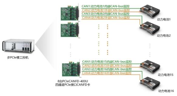 若電池測試項目現(xiàn)場使用多PCIe槽的工控機,ZLG致遠電子提供多通道PCIe接口的PCIeCANFD-400U卡搭載工控機來進行監(jiān)控的方案,外擴4路相互獨立的CAN/CANFD通道,實時監(jiān)控動力電池內(nèi)外CAN/CANFD總線的情況。