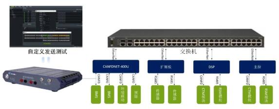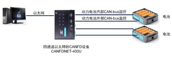 若測試現(xiàn)場采用以太網(wǎng)來實現(xiàn)整個測試情況的監(jiān)控,ZLG致遠電子推出多通道CAN/CANFD轉(zhuǎn)以太網(wǎng)設(shè)備CANFDNET-400U通用方案,通過以太網(wǎng)實現(xiàn)“一拖四”CAN/CANFD相互獨立的通道,甚至ZLG還提供多大8通道的CANET-8E-U,實現(xiàn)8路CAN通道電池數(shù)據(jù)的監(jiān)控。