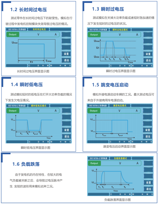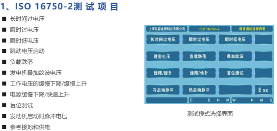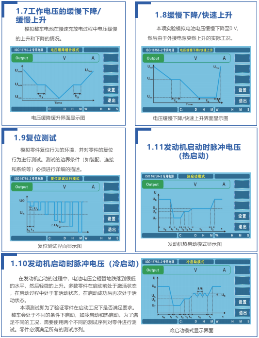 航裕電源為滿足車載儀表電性能測試的多種需求,深入挖掘ISO16750-2、LV124、LV148、GB28046.2、SMTC38000001、VW80000、GS95024-2、GW3172等測試標準的電性能測試需求,可進行紋波疊加、瞬時過壓/低壓、冷/熱啟動、跳變電壓啟動、反極性測試、地偏移、緩降緩升、緩降快升、復位、脈沖等測試。