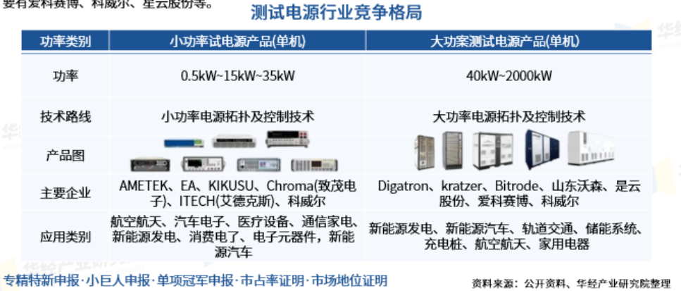 測試電源伴隨著科研和工業領域同步發展,產業發展周期較為悠久,產品技術相對成熟,廣泛應用于科研試驗、航空航天、醫療設備、通信電子、消費電子、電子元器件等傳統行業。在傳統工業領域發展較早的歐美日以及中國臺灣地區,積累了一批具備較強先發優勢的廠商,包括AMETEK、EA、致茂電子等。大陸地區的測試電源企業也逐漸發展起來,主要有愛科賽博、科威爾、星云股份等。