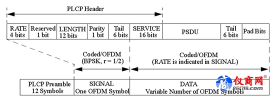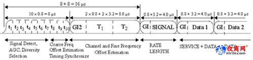 OFDM(正交頻分復(fù)用)作為WLAN主要的多載波調(diào)制方案, 近年來倍受關(guān)注。由于OFDM 能有效抑制多徑時(shí)延, 且頻譜利用率較高, 被廣泛認(rèn)為是在無(wú)線時(shí)變信道中實(shí)現(xiàn)高速數(shù)據(jù)傳輸?shù)闹匾侄巍?span>WLAN信號(hào)分析模塊主要完成載波同步、定時(shí)同步、去除CP、FFT解調(diào)、信道估計(jì)、反映射等。物理層幀格式如下: