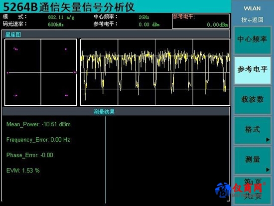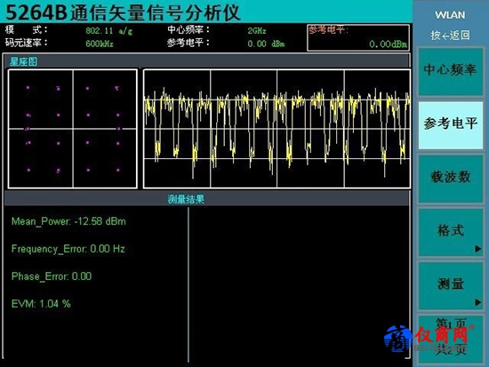 3.配置信號(hào)源發(fā)射64QAM調(diào)制信號(hào),頻點(diǎn)2.0G, WLAN模式為a/g(OFDM );配置分析儀頻點(diǎn)設(shè)置為2.0G, WLAN模式為a/g(OFDM ),測(cè)試結(jié)果如下: