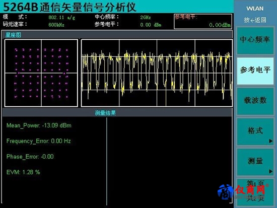 針對(duì)OFDM物理層信號(hào)特點(diǎn),WLAN信號(hào)分析儀采用選件方式進(jìn)行信號(hào)模擬和信號(hào)質(zhì)量測(cè)試,測(cè)試結(jié)果如下: