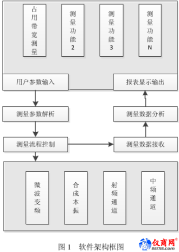 頻譜分析儀多種測量功能的實現原理是基于統一的分析儀硬件平臺,設計多模式的分析軟件架構。在保持同一硬件平臺下,針對不同的測量功能需求,設計不同的用戶界面接口,維護不同的測量狀態集合,并執行不同的掃描測量流程,然后運用不同的測量分析算法,實現每種測量功能要求的報表風格,最終實現滿足功能要求的測量效果。如圖1所示,軟件結構主要包括:用戶參數輸 入、測量參數解析、測量流程控制、測量數據接收、測量數據分析、報表顯示輸出等模塊。