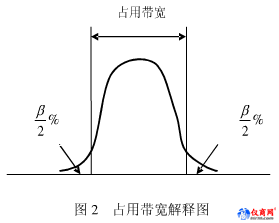 根據ITU規定,占用帶寬是指這樣一種帶寬:在它的頻率下限之下和頻率上限之上所發射的平均功率各等于某一給定發射的總平均功率的規定百分數β/2,如圖2所示: