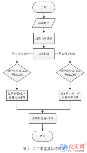 通常取β/2=0. 5%,用戶也可以根椐需要設置。在計算時,在整個頻寬上對功率P(f)沿頻率積分,就可以得到整個頻寬內的總功率ΣP,即總功率是P(f)曲線下的面積;再求出達到總功率0.5%和99.5%的兩個頻率點來,那么,這兩個頻率點之間的寬度就集中了全部功率99%的占用帶寬值。占用帯寬的計算流程如圖3所示: