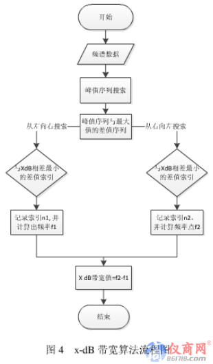 x-dB帯寬定義為某頻帶寬度在這頻帶之外所有頻譜分量都比發射的峰值電平低6dB以上,或者低 26dB以上。在常規監測條件下,占用帶寬測試比較困難,而對于調幅、調頻和常用數字解調等大多數信號方式,其發射頻譜能量的主要部分(95%以上的能量)集中在26dB帶寬之內,因此如果信號發射類別和調制參數完全已知,x-dB帶寬可以用來代替估計占用帶寬,因此在占用帶寬測量功能中通常需要提供x-dB帶寬的測量功能。x-dB帶寬的實現流程如圖4所示,具體計算步驟如下: