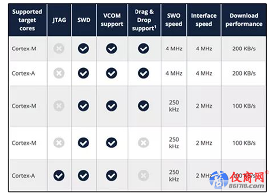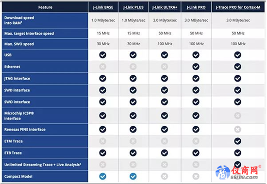 比較調(diào)試器之間差異的一種很好的方法是檢查 SEGGER 提供的調(diào)試工具。很多不同微控制器供應(yīng)商的多種開發(fā)套件都提供了基于 SEGGER J-link 的 OB 調(diào)試器。下圖顯示了面向各種目標(biāo)內(nèi)核的不同 J-link OB 調(diào)試器的典型特性集(圖 1)。