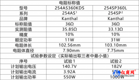 在整個測試過程中,254SP系列陶瓷電阻無冒煙、著火現象,也沒有出現爆炸現象。待電阻冷卻后,觀察電阻表面,電阻兩端略微發黑,標記變暗淡,端帽部分出現氧化。此時測量阻值為36.9Ω,阻值變化約11.4%。