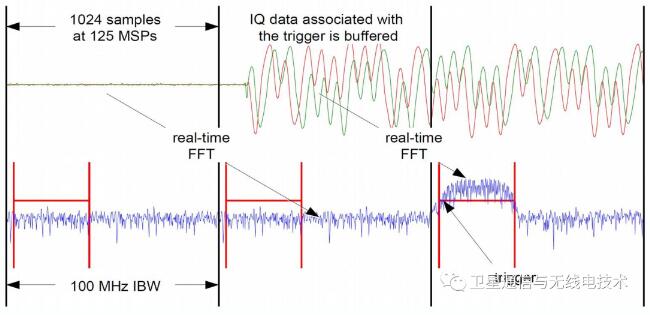 下圖舉例說明了工作于 100 MHz IBW 的時域和頻域的聯系。內部頻域數據比時域數據滯后一個此處未顯示的延遲,以簡化說明。觸發后如果檢測到事件,則隨后的時域 IQ 數據將存儲到內存中。