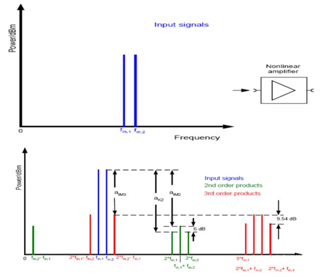 當輸入兩個不同頻率的正弦波到非線性,輸出除了這個兩個信號以及他們的諧波外,還有諧波的和頻和差頻,這些新頻率分量稱為互調失真。