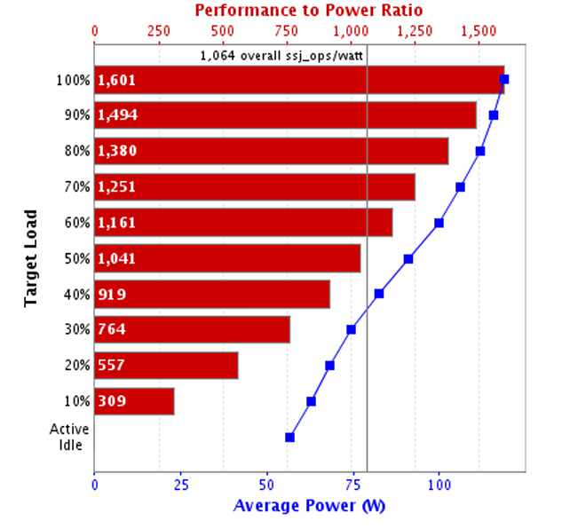 紅色條 (性能功耗比): 代表每個負載點的效率,條形越長、數值越高越好。 藍色線 (平均功耗): 代表每個負載點的實際功耗,線條越低、數值越低越好。 垂直細線 (綜合能效):代表最終的ssj_ops/watt總分,位置越靠右、數值越高越好。