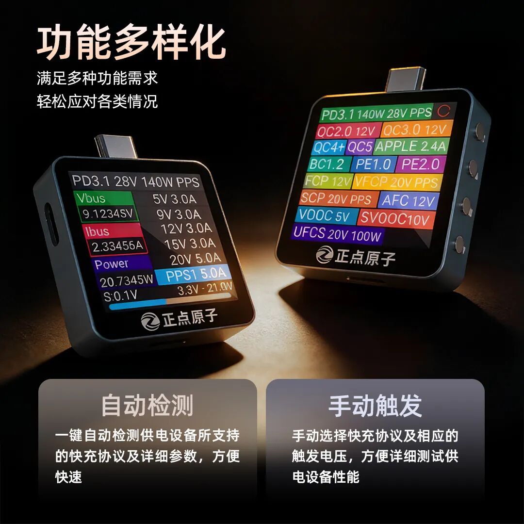 QC、PD、華為 FCP、OPPO VOOC 等主流快充協議全覆蓋,自動檢測設備支持的快充參數,手動觸發功能更可精準調試供電性能,滿足研發、質檢、發燒友等全場景需求。